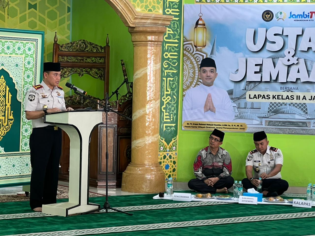 Dalam kegiatan tersebut, hadir Ustadz Prof. Dr. Supian Ramli, S.Ag., M.Ag. sebagai penceramah utama yang menyampaikan tausiah keagamaan kepada seluruh jamaah. Dalam ceramahnya, ia menekankan pentingnya memperkuat nilai-nilai spiritual sebagai bekal dalam menjalani kehidupan, khususnya bagi warga binaan yang tengah menjalani masa pembinaan.